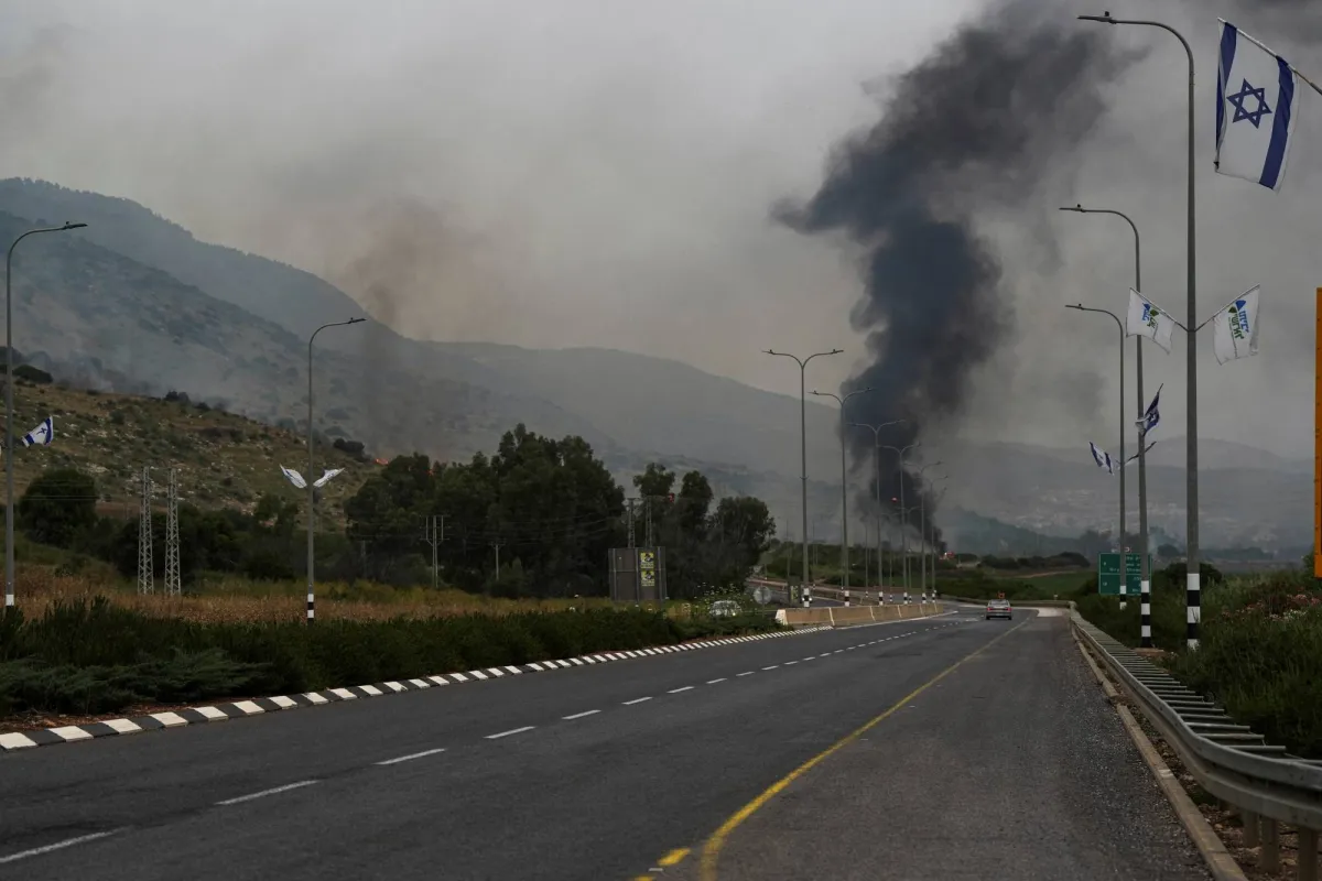 يتصاعد الدخان فوق مدينة كريات شمونة عقب إطلاق صاروخ من لبنان باتجاه إسرائيل الاسبوع الماضي (رويترز)