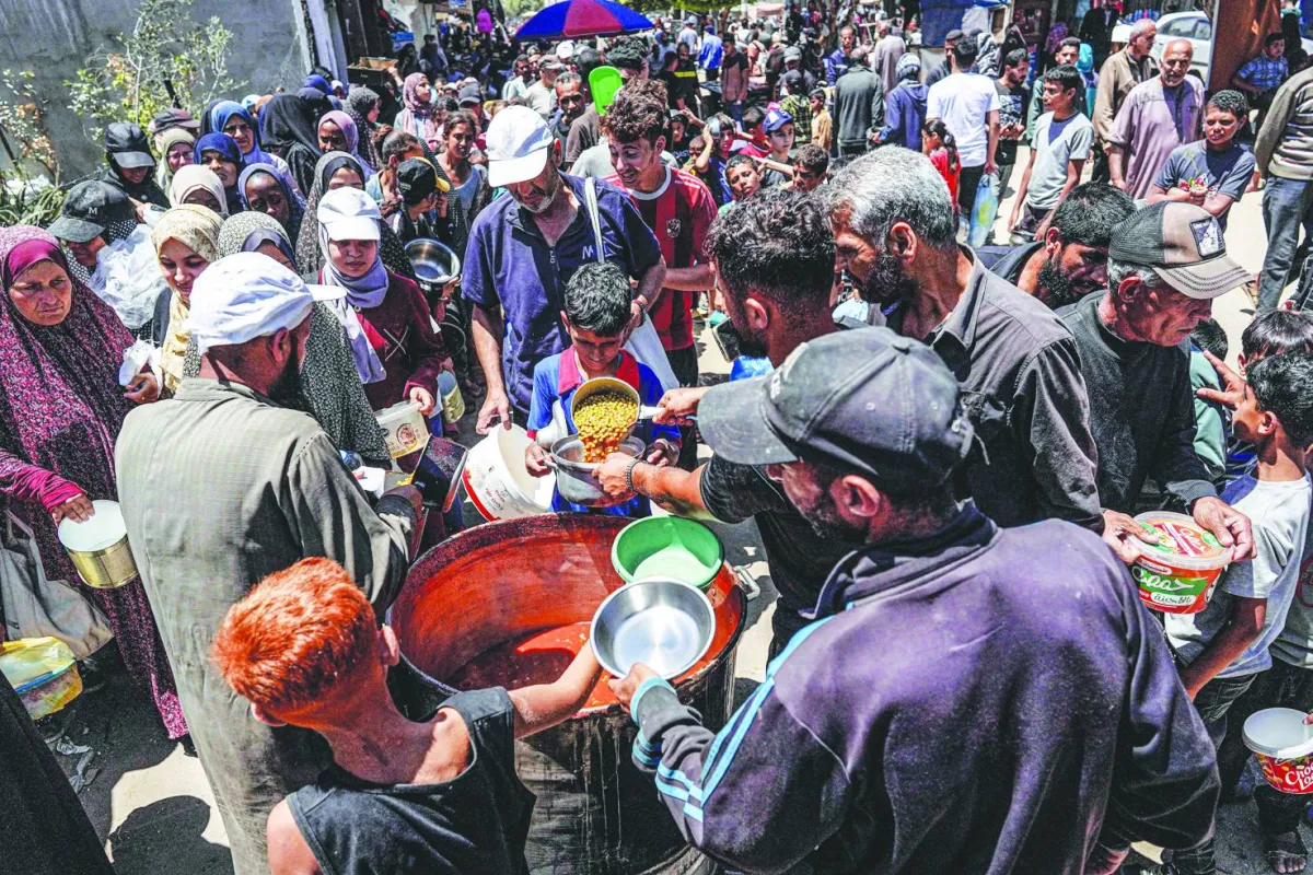 توزيع الطعام على السكان في دير البلح وسط قطاع غزة أمس (أ.ف.ب)