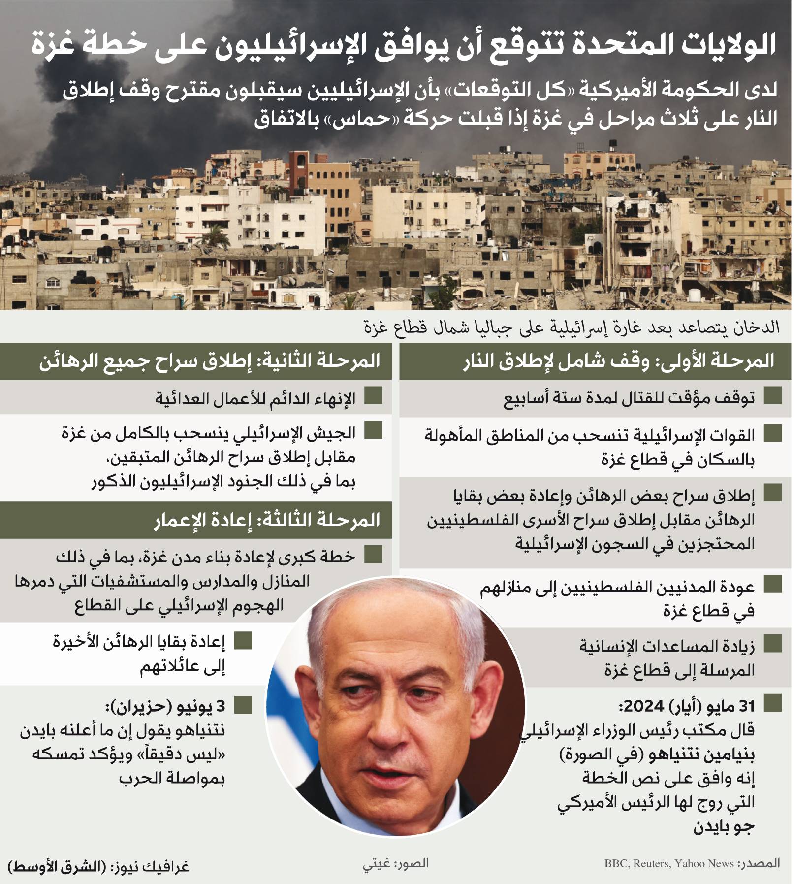 أظهرت تصريحات رئيس الوزراء الإسرائيلي بنيامين نتنياهو، اليوم (الاثنين)، أن إسرائيل مستعدة لمناقشة وقف الحرب، لكنها لا تتعهد بذلك، في أحدث تفسير لموقف إسرائيل من الاقتراح الذي عرضه الجمعة الرئيس الأميركي جو بايدن، ووصفه نتنياهو بأنه «غير دقيق».