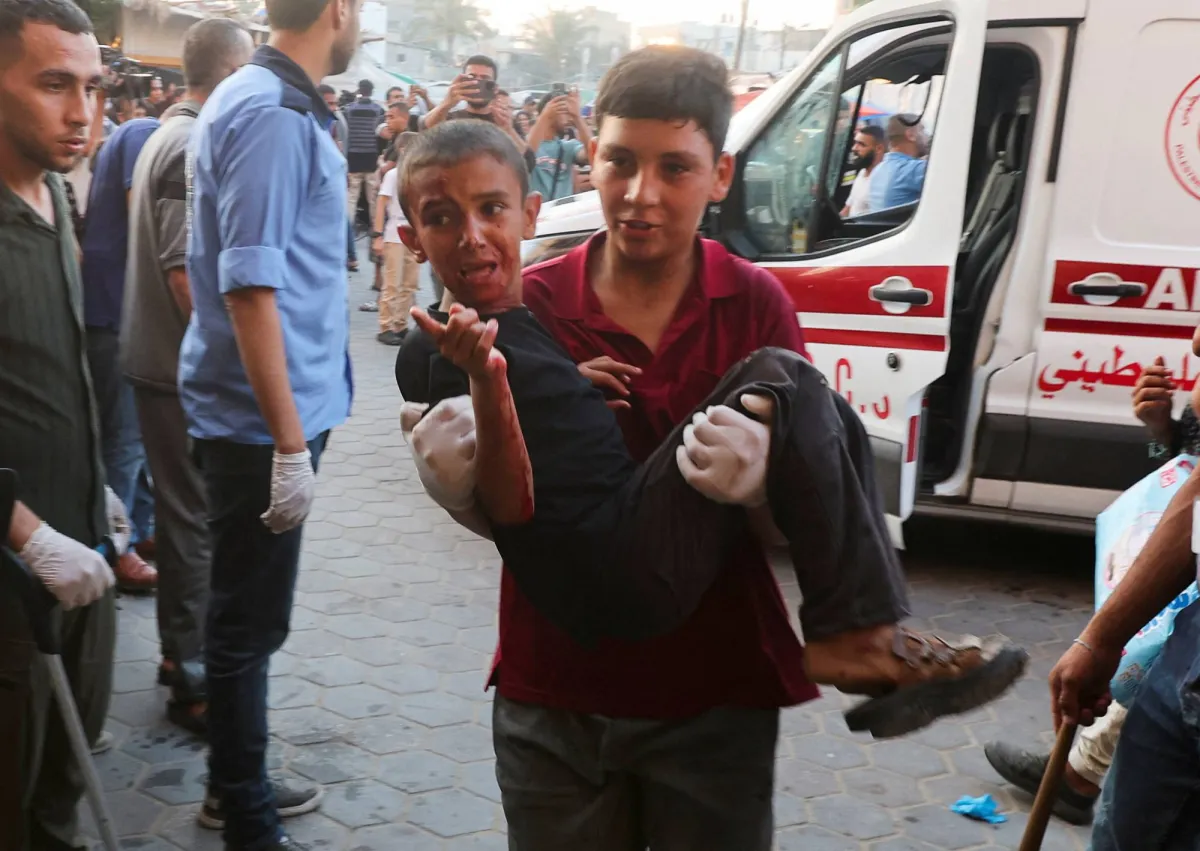 طفل يحمل آخر مصاباً إثر القصف الإسرائيلي على دير البلح (رويترز)