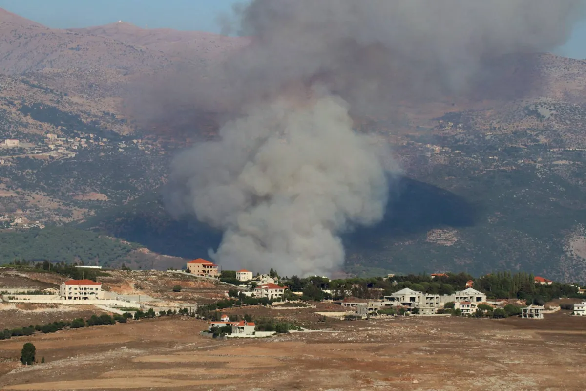 أعمدة الدخان تتصاعد من موقع غارة جوية إسرائيلية استهدفت أطراف قرية كفر حمام في جنوب لبنان في 9 أغسطس 2024، وسط اشتباكات حدودية متواصلة بين القوات الإسرائيلية و"حزب الله" (أ.ف.ب)