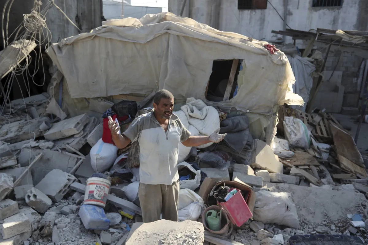رجل يتفاعل وهو يقف على أنقاض مبنى تضرر في غارة جوية إسرائيلية في قرية عقبة الجنوبية بلبنان (أ.ب)