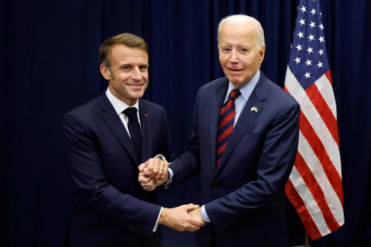 الرئيس الفرنسي إيمانويل ماكرون مصافحاً الرئيس الأميركي جو بايدن خلال لقاء على هامش الدورة السنوية الـ79 للجمعية العامة للأمم المتحدة في نيويورك (أ.ف.ب)