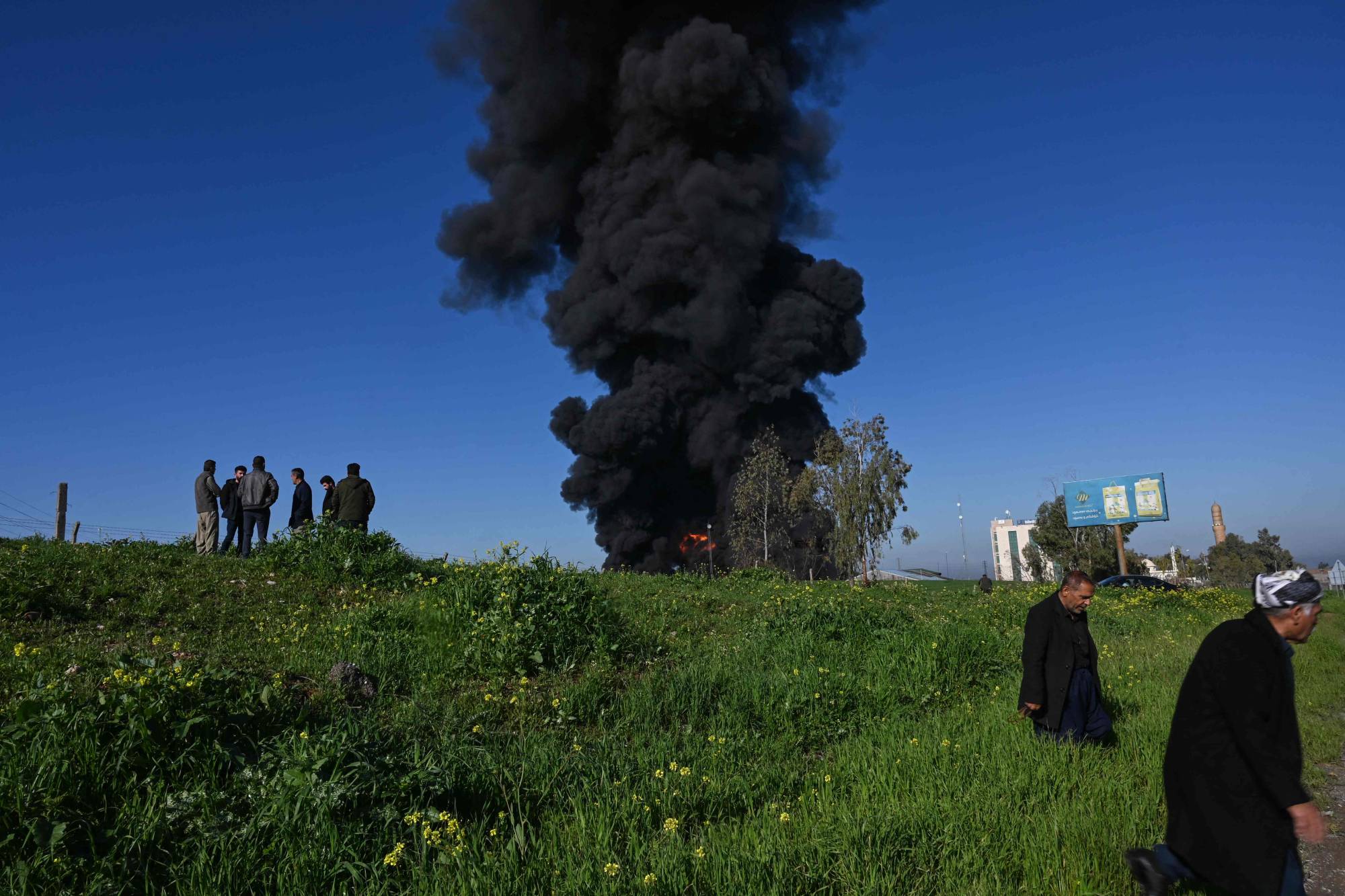 دخان يتصاعد من مستودع نفطي على مشارف أربيل عاصمة إقليم كردستان العراق في أعقاب غارة بطائرة مسيّرة 1 أبريل 2026 (أ.ف.ب)