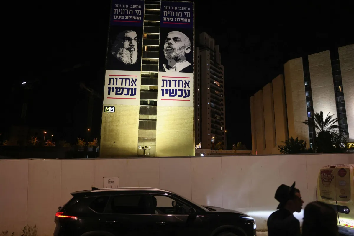 لوحة إعلانية في أحد شوارع القدس تحمل صورة يحيى السنوار وحسن نصر الله وكُتب عليها بالعبرية: «من يستفيد من فُرقتنا؟ الوحدة الآن» (أ.ف.ب)