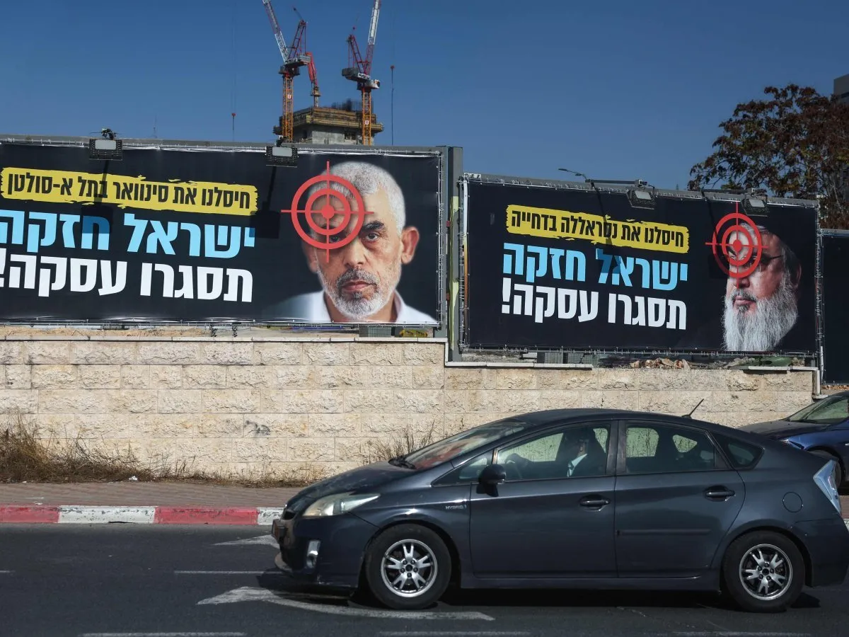 لافتات في القدس تنادي بعقد صفقة لإطلاق الأسرى الإسرائيليين في غزة بجانب صورة لزعيم «حماس» يحيى السنوار وأخرى لزعيم «حزب الله» حسن نصر الله اللذين قتلتهما إسرائيل في سبتمبر وأكتوبر الماضيين (أ.ف.ب)