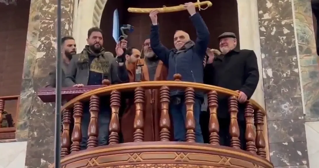 لقطة من فيديو متداول على مواقع التواصل الاجتماعي تُظهر رغيد الططري وهو يحمل سيفاً ذهبياً في حماة (إكس)