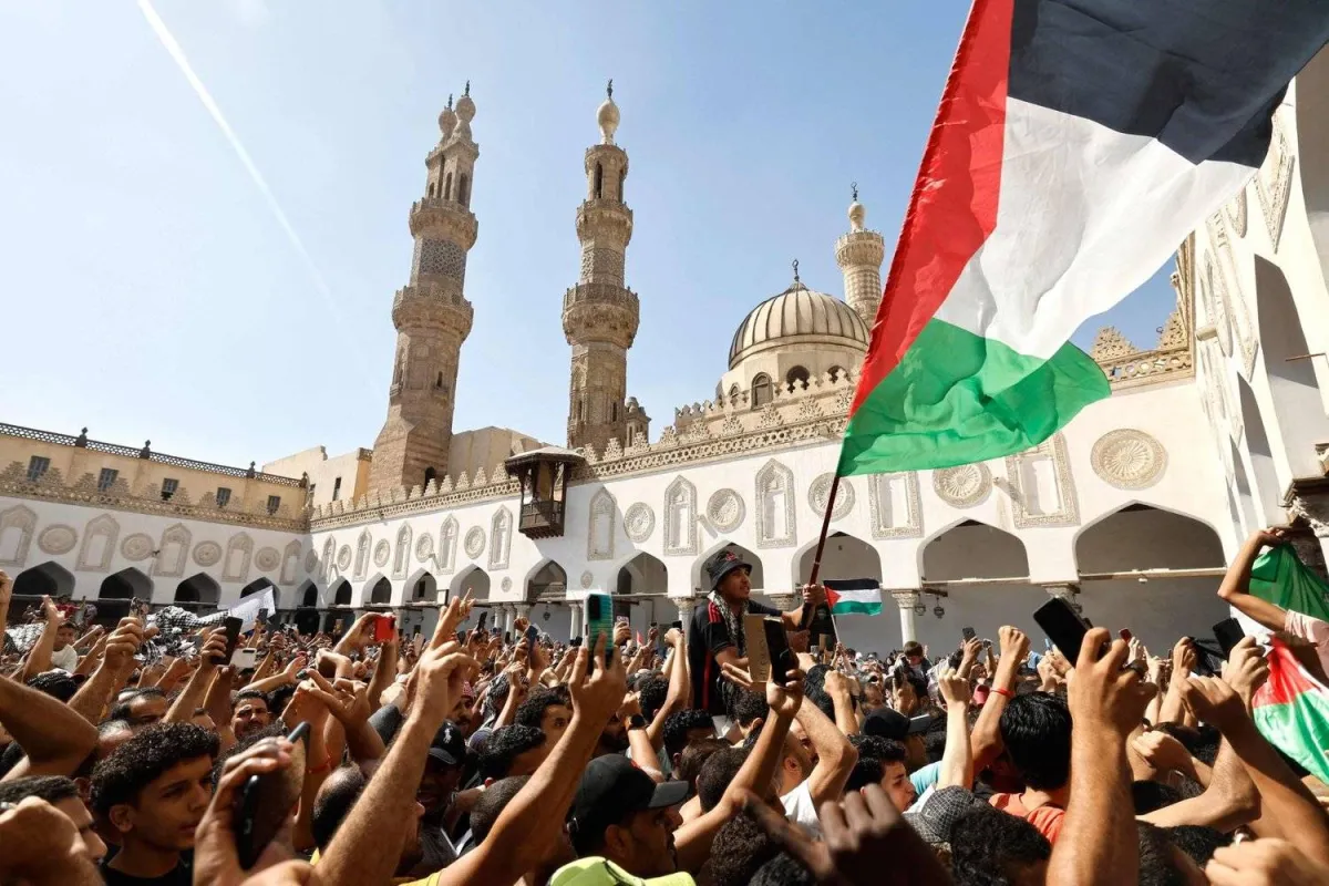 مصلون بالجامع الأزهر يُلوّحون بالعلم الفلسطيني خلال احتجاجات ضد العدوان الإسرائيلي في نوفمبر الماضي (أ.ف.ب)