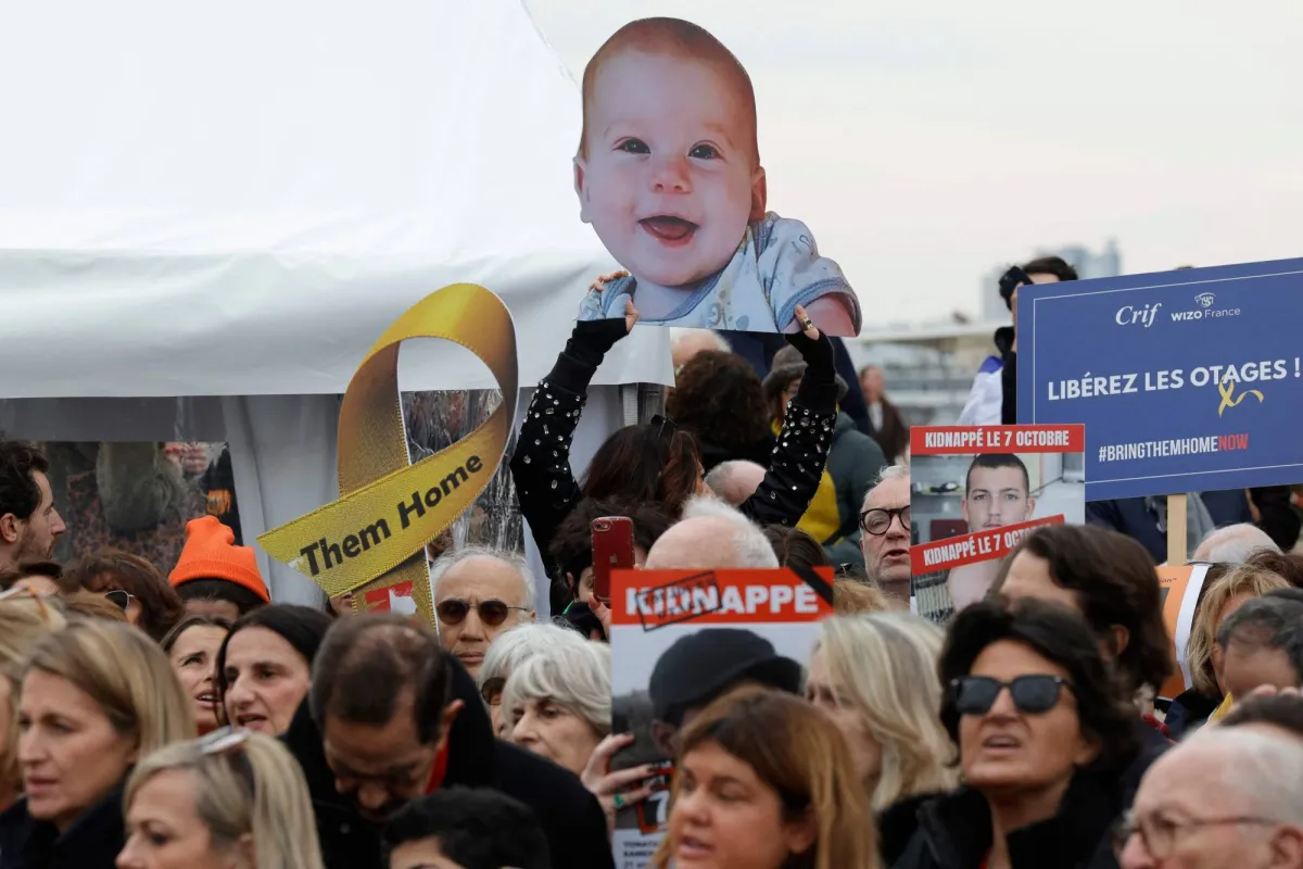 أحد المشاركين في تجمّع تكريماً للرهائن الإسرائيليين يحمل لافتة تحمل صورة الطفل كفير بيباس في باريس (أ.ف.ب)