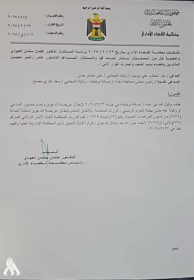 وأضافت أن «محكمة القضاء الإداري قررت إبطال عريضة الدعوى، بناءً على الطلب المقدم من قبل المدعى عليه (رئيس مجلس محافظة بغداد)، وإلغاء الأمر الولائي لانتفاء مبرراته بعد إبطال الدعوى».