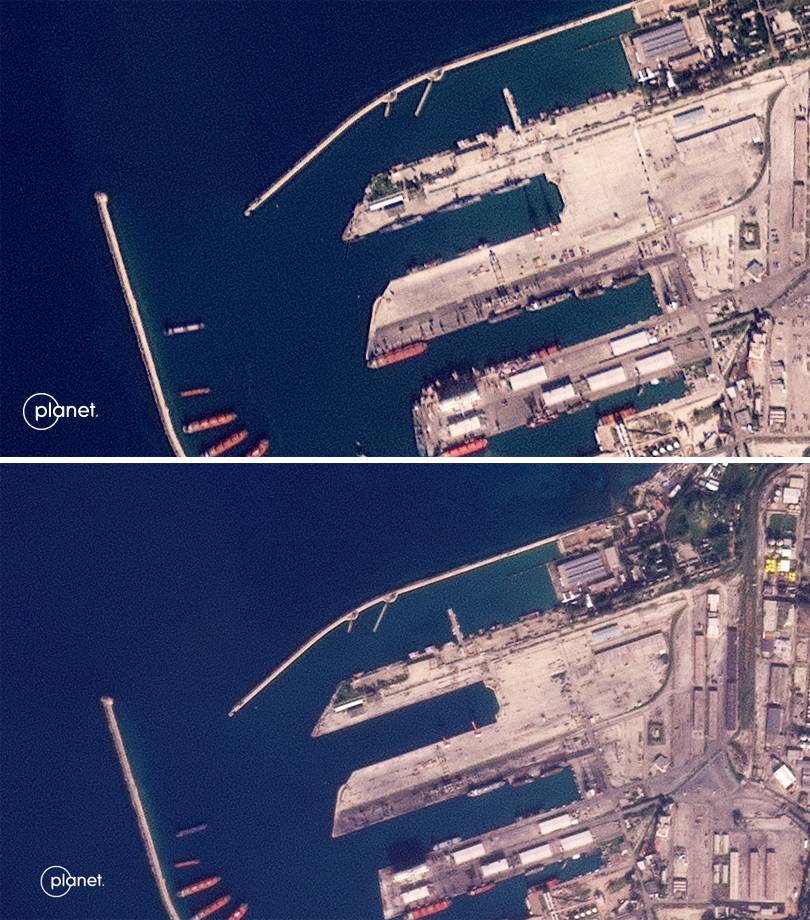 صورتان بالأقمار الاصطناعية تظهران القاعدة البحرية الروسية في طرطوس قبالة البحر الأبيض المتوسط في 3 ديسمبر 2024 (أسفل) و9 ديسمبر (أ.ف.ب)