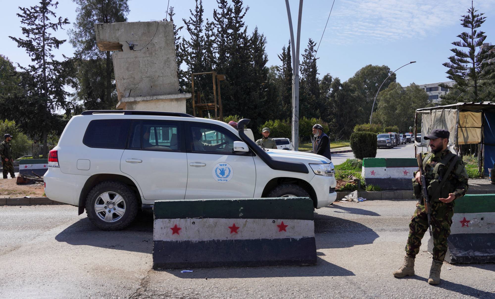 سيارة تابعة لبرنامج الغذاء العالمي تسير عند نقطة تفتيش لقوات الأمن السورية عند مدخل اللاذقية بسوريا 10 مارس 2025 (رويترز)