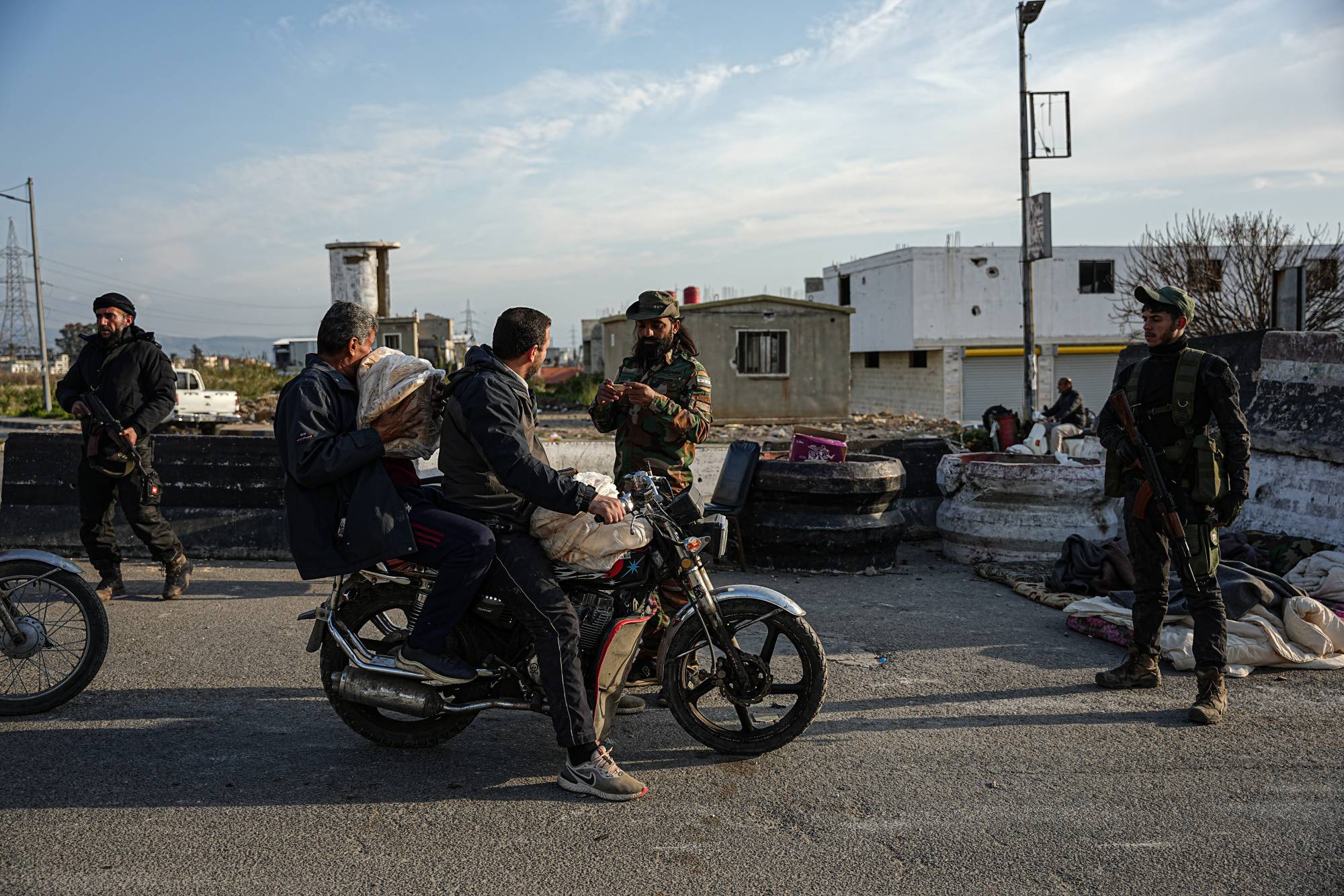 عناصر من قوات الأمن السورية يوقفون المركبات عند نقطة تفتيش في أعقاب أعمال العنف التي اندلعت بالأيام السابقة خلال الاشتباكات بين القوات الحكومية وأنصار النظام السوري السابق ببلدة جبلة باللاذقية بسوريا 9 مارس 2025 (إ.ب.أ)