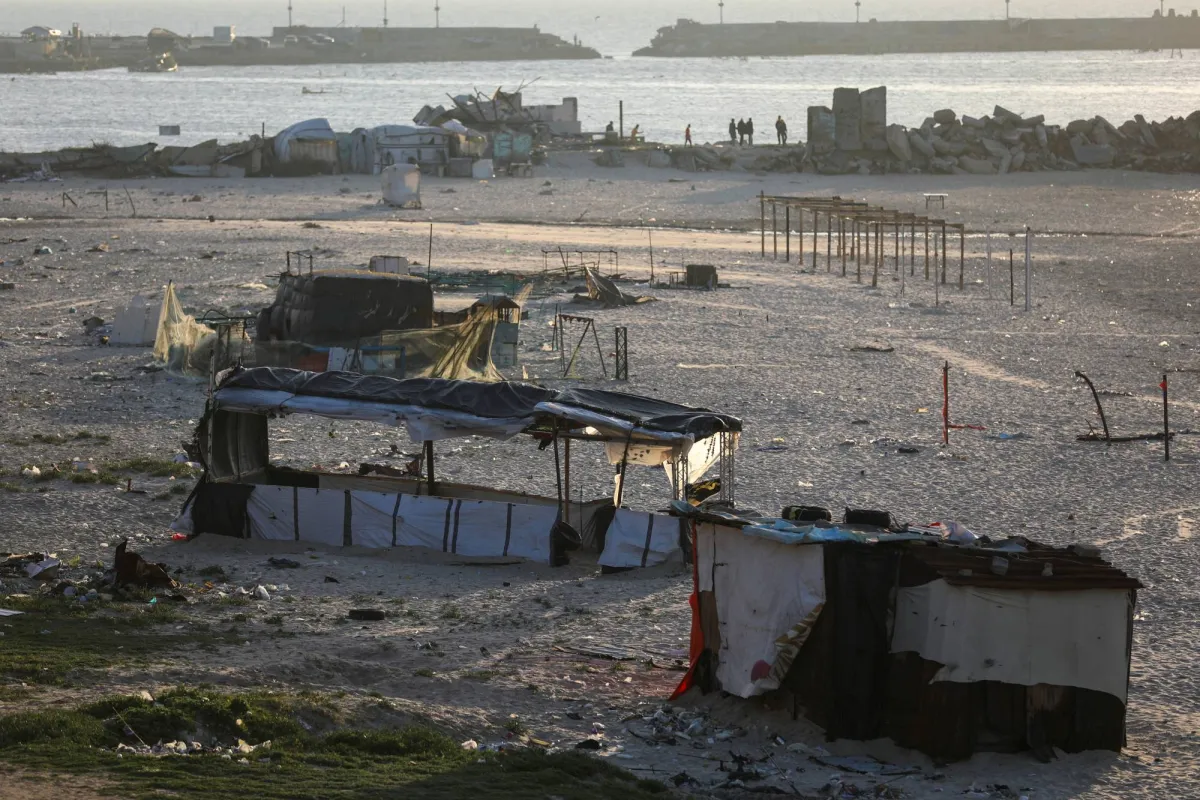فلسطينيون يتجمعون على الشاطئ بالقرب من الملاجئ التي تضررت خلال الهجوم الإسرائيلي في مدينة غزة (رويترز)