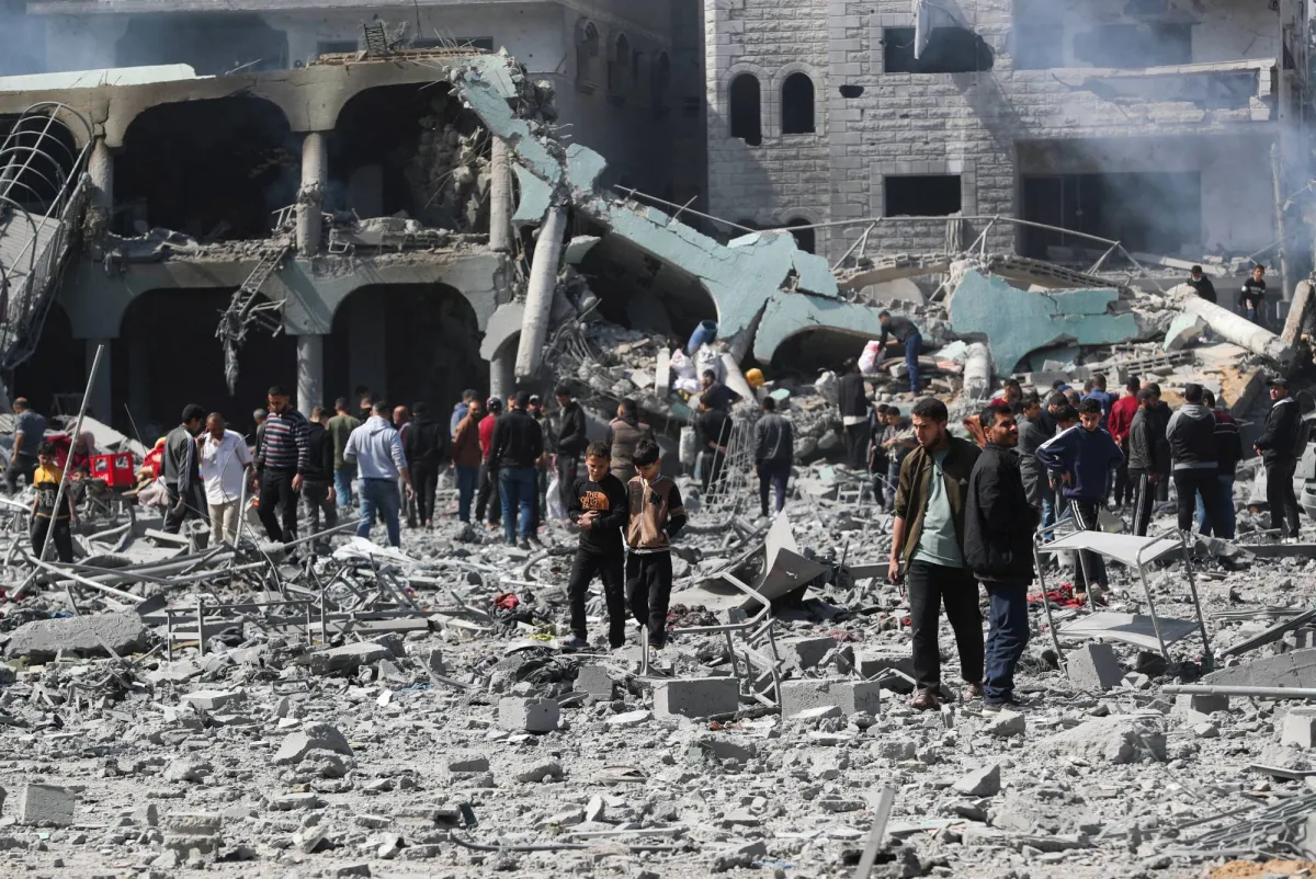 فلسطينيون يتفقدون الأضرار التي لحقت بمدرسة يلجأ إليها النازحون بعد قصف إسرائيلي في مدينة غزة (رويترز)