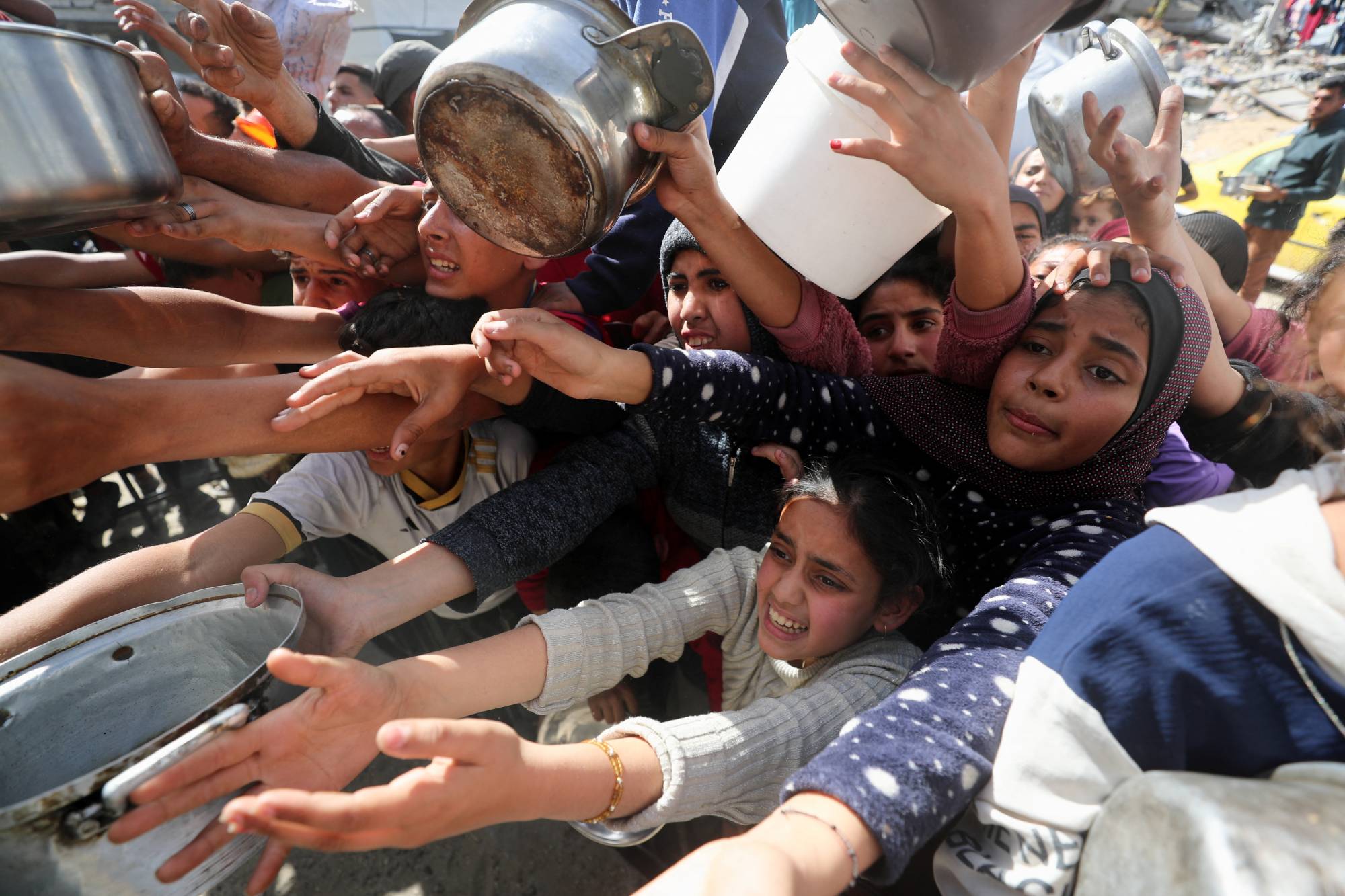 أطفال يتهافتون للحصول على وجبة من مطبخ خيري في بيت لاهيا بشمال قطاع غزة في 3 أبريل 2025 (رويترز)