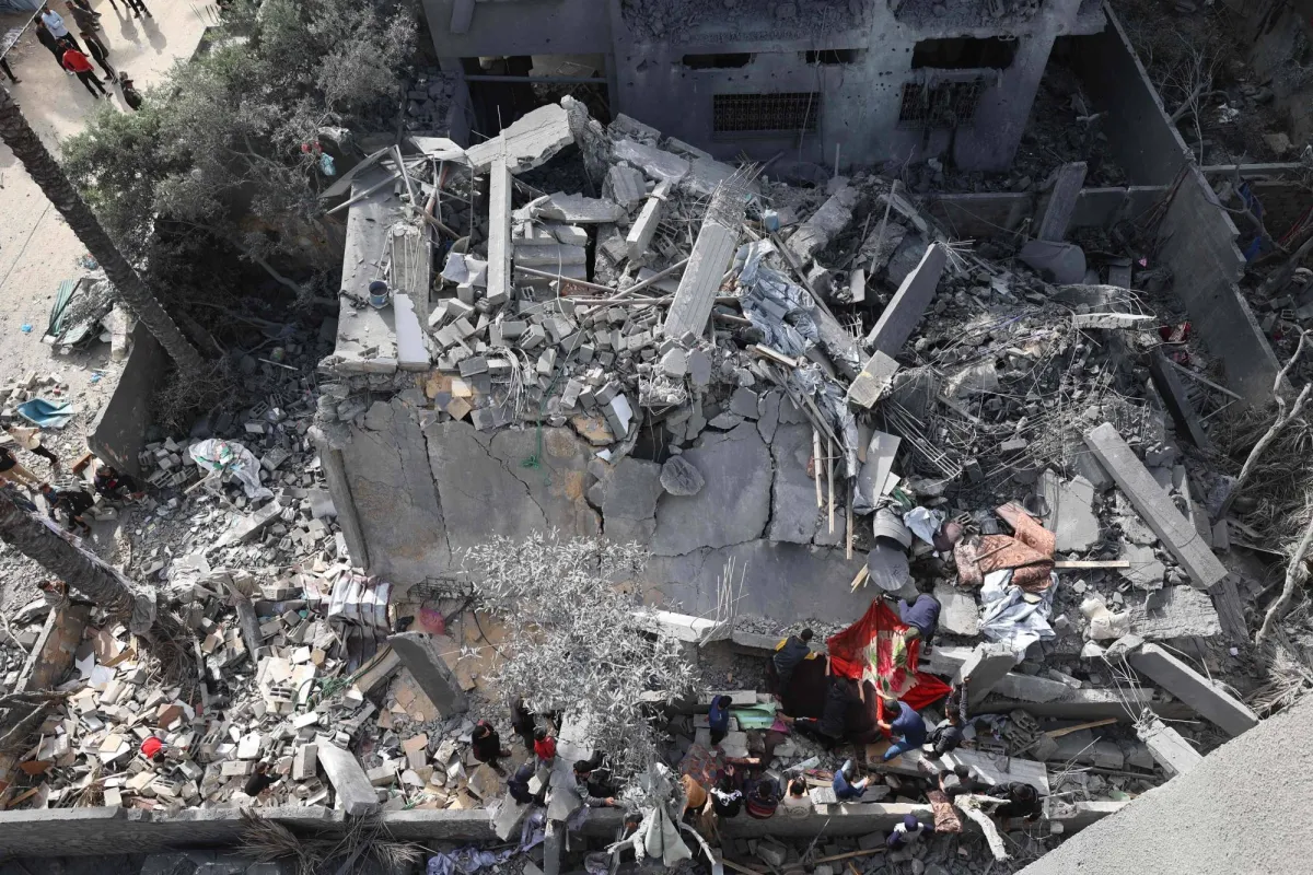 أشخاص يتفقدون الدمار في دير البلح وسط قطاع غزة في 7 أبريل 2025 بعد غارات جوية إسرائيلية ليلية (أ.ف.ب)