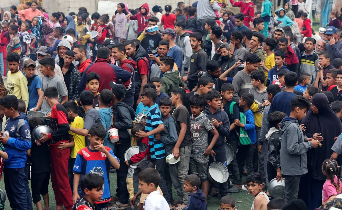 فلسطينيون مصطفون في انتظار الطعام وسط قطاع غزة يوم 8 أبريل 2025 (رويترز)