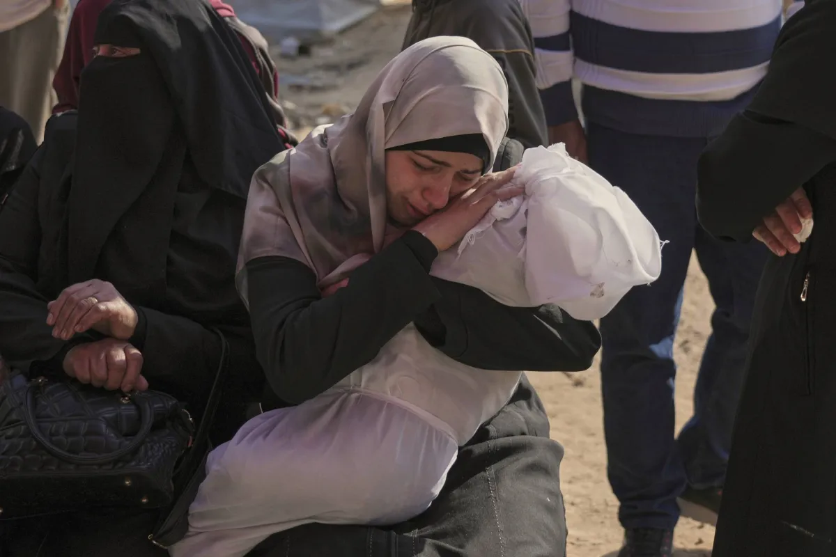 فلسطينية تحمل ابنها الذي قُتل في غارة جوية للجيش الإسرائيلي خلال جنازته في المستشفى الإندونيسي ببيت لاهيا شمال قطاع غزة (أ.ب)