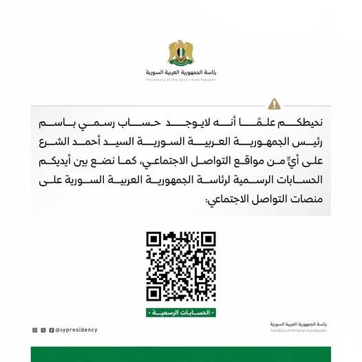 وحذرت رئاسة الجمهورية من انتشار حسابات مزورة باسم الرئيس الشرع، وقالت في بيان رسمي: «نحيطكم علماً أنه لا يوجد حساب رسمي باسم رئيس الجمهورية العربية السورية السيد أحمد الشرع على أي من مواقع التواصل الاجتماعي».