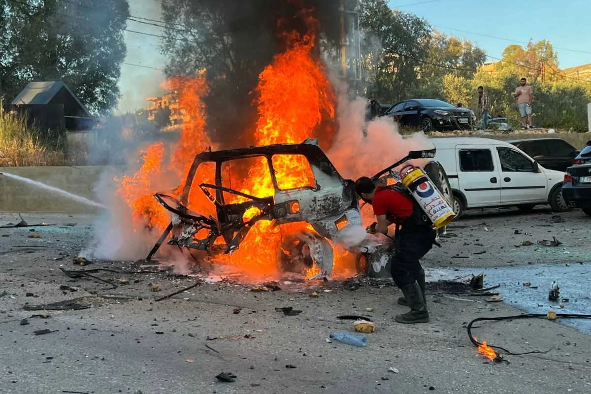 محاولة إطفاء سيارة قصفتها مسيّرة إسرائيلية في بلدة كفررمّان بجنوب لبنان (أ.ف.ب)