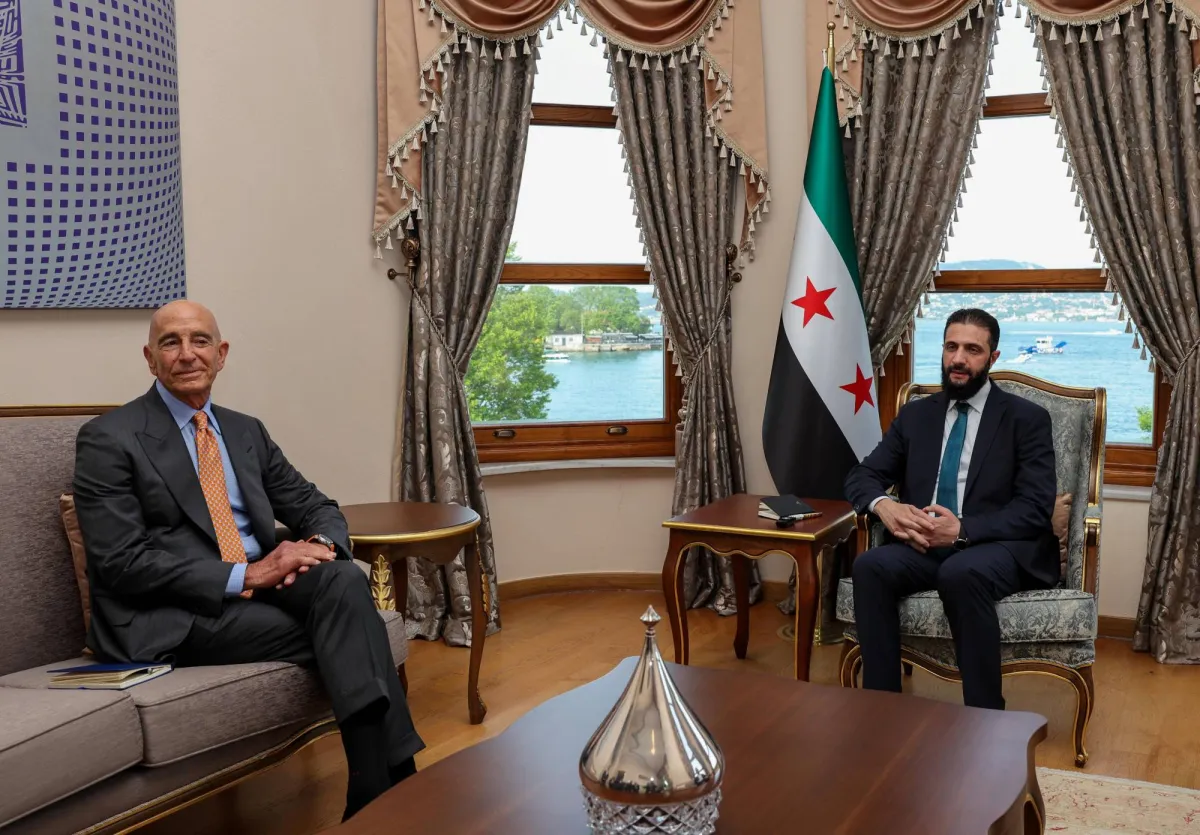 الرئيس السوري أحمد الشرع والمبعوث الأميركي إلى سوريا توماس براك (رويترز)
