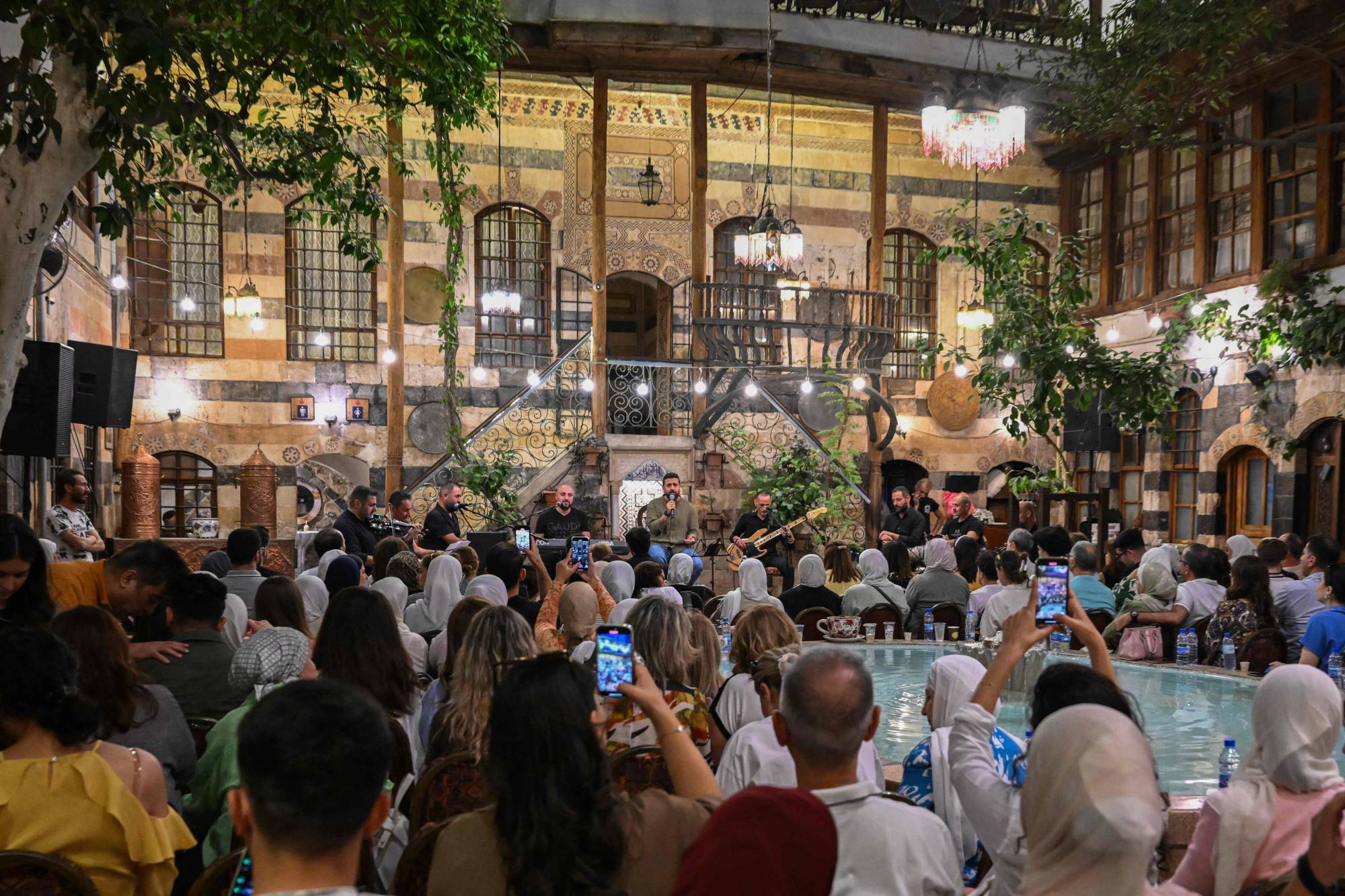 سوريون يحضرون حفلة موسيقية في مطعم بنت جبري في دمشق القديمة في الاثنين الماضي (أ.ف.ب)