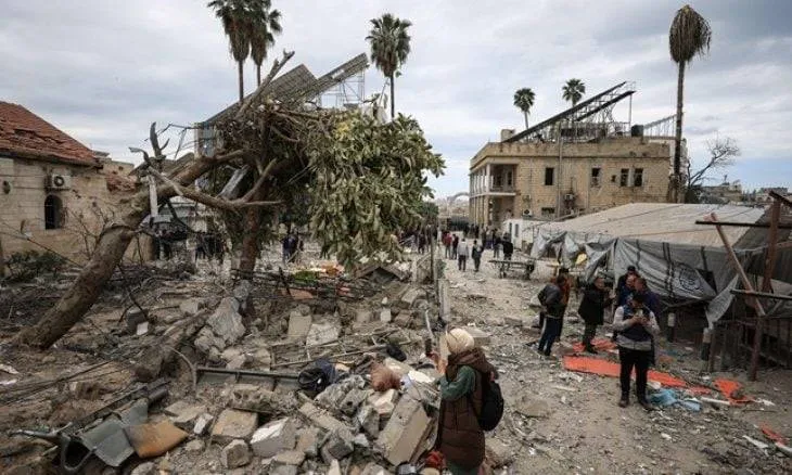 فلسطينيون يتفقدون الأضرار بعد سقوط صاروخين إسرائيليين على مبنى داخل «المستشفى المعمداني» في غزة يوم 13 أبريل 2025 (رويترز)