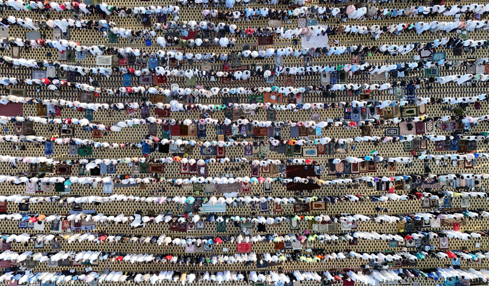 صورة جوية لسوريين يؤدون صلاة العيد في ساحة الجندي المجهول بدمشق الجمعة (إ.ب.أ)