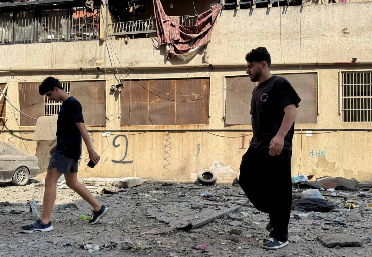 مواطنان يتفقدان الدمار الذي خلّفه القصف الإسرائيلي على الضاحية الجنوبية لبيروت (رويترز)