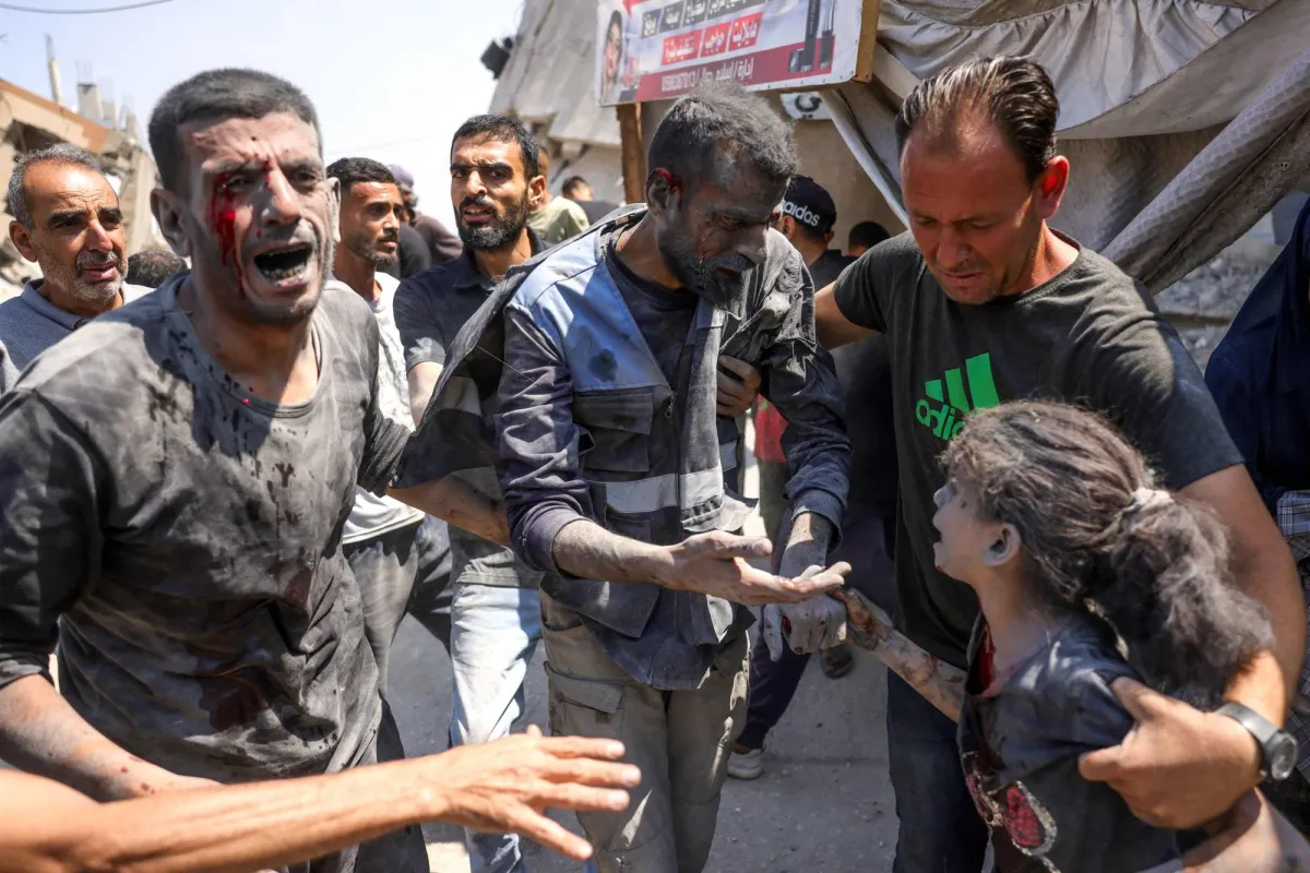 طفلة مصابة تندفع نحو قريب لها أنقذ من ركام منزل دمرته ضربة إسرائيلية غرب جباليا في شمال قطاع غزة أمس (أ.ف.ب)