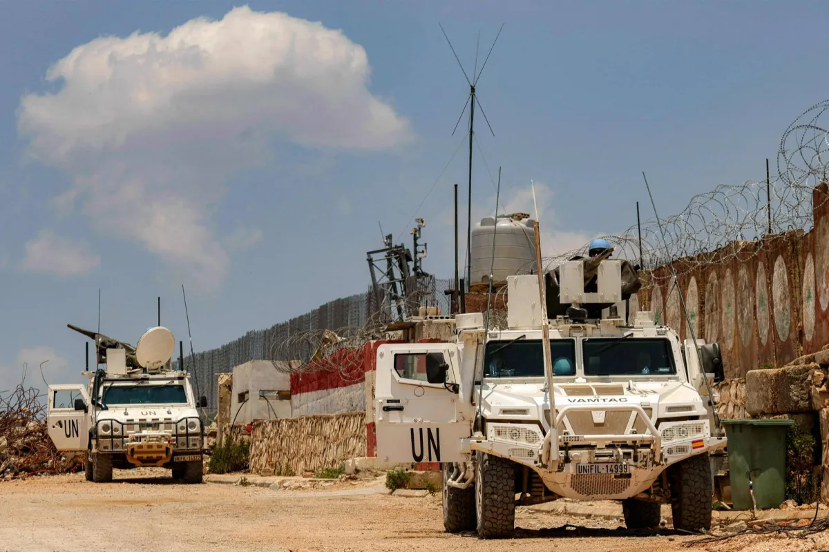 جنود حفظ السلام التابعون لقوة الأمم المتحدة المؤقتة في لبنان (اليونيفيل) يسيّرون دورية على طول الحدود مع إسرائيل بالقرب من قرية كفركلا في جنوب لبنان (أ.ف.ب)