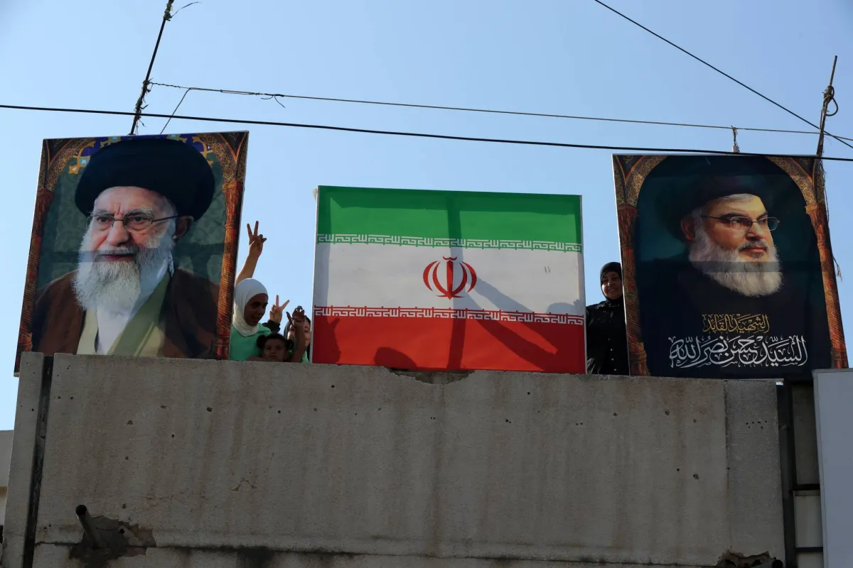 أشخاص يرفعون علامة النصر بجوار صورة خامنئي والعلم الإيراني وصورة الراحل نصر الله (إ.ب.أ)