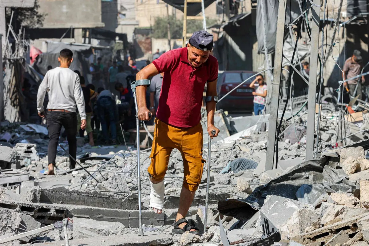رجل يمشي باستخدام عكازين بين الأنقاض بعد غارات إسرائيلية على جباليا في شمال قطاع غزة (أ.ف.ب)