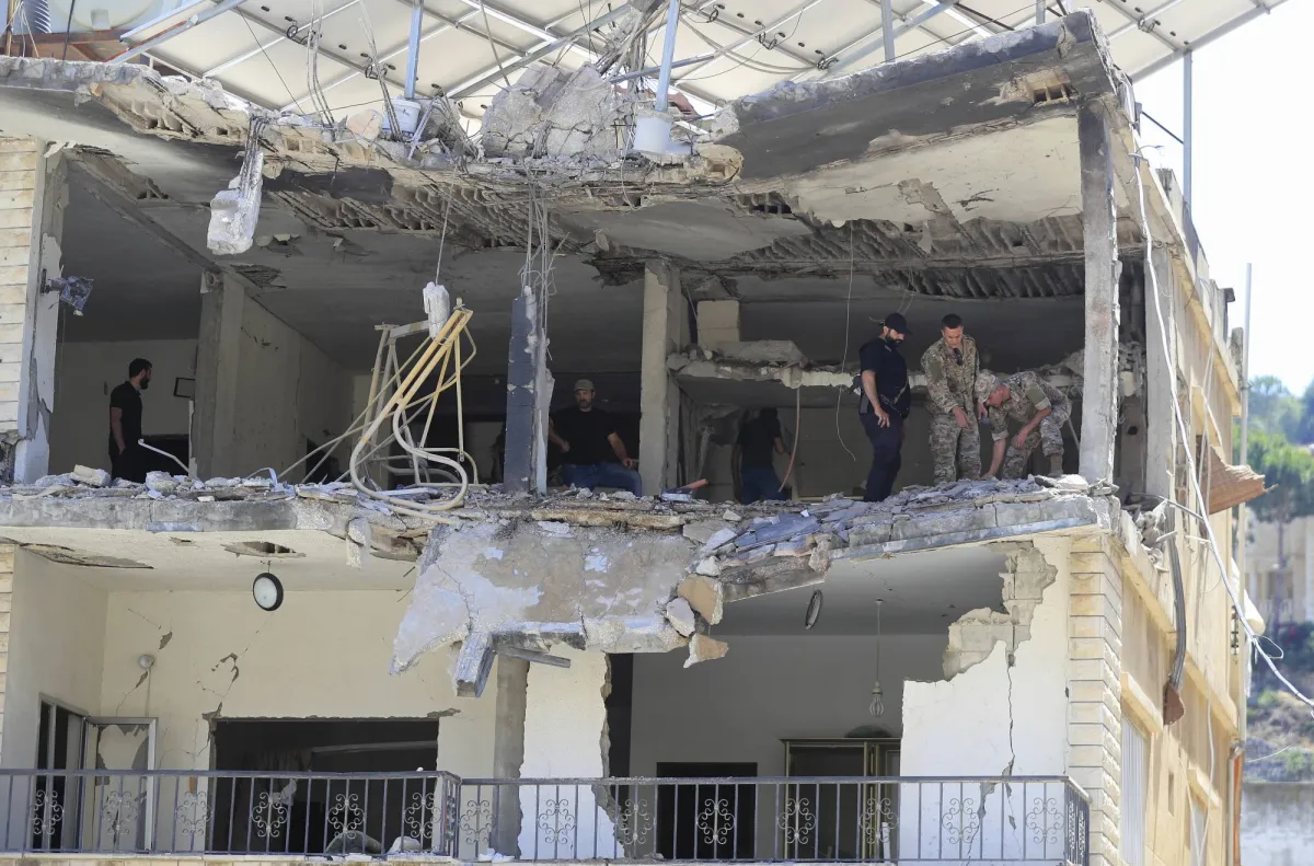 جنود من الجيش اللبناني يتفقدون منزلاً مدمراً تعرض لقصف إسرائيلي في النبطية جنوب لبنان (أ.ب)