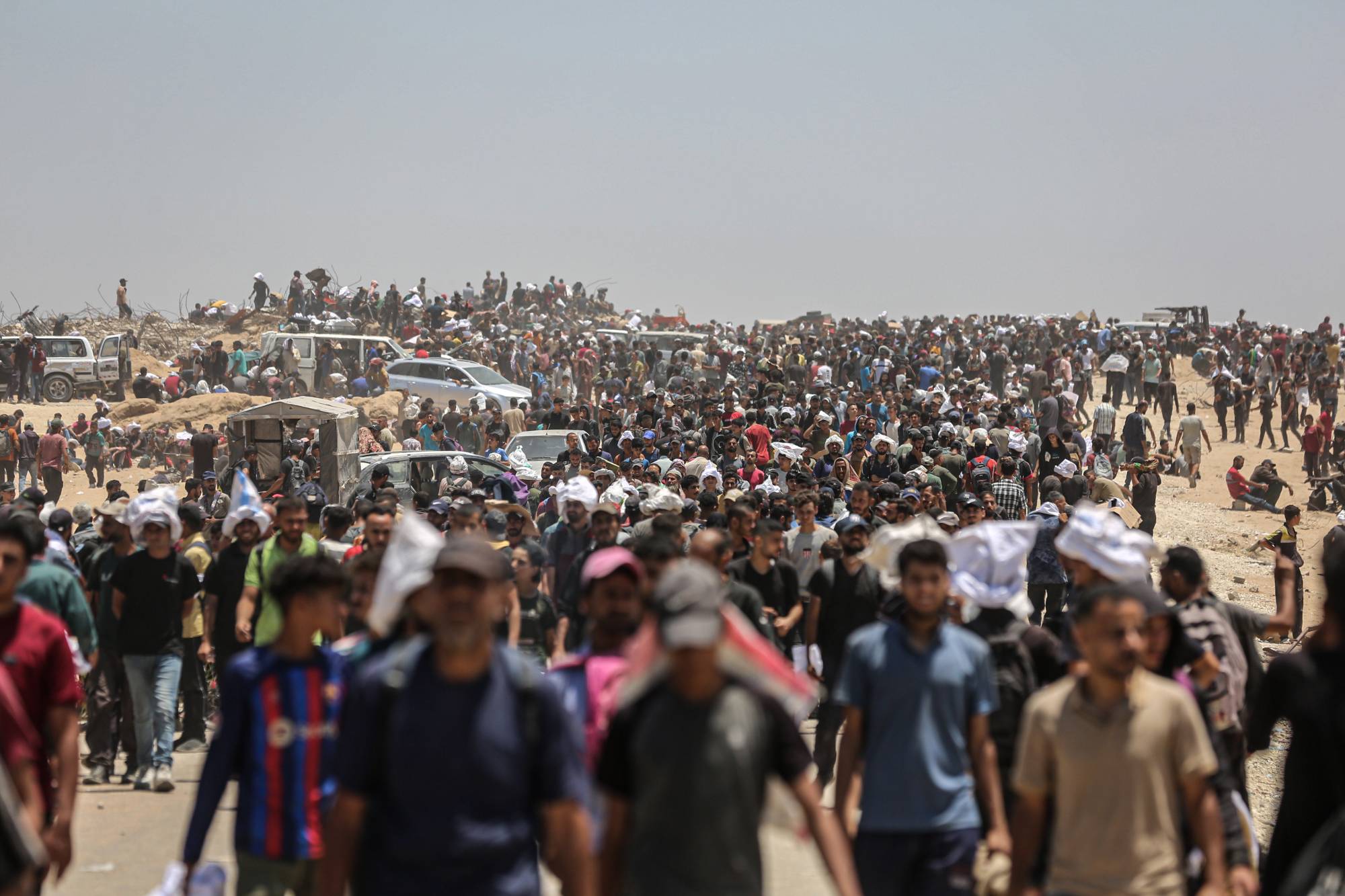 فلسطينيون يتجمعون جنوب مدينة غزة في انتظار تسلم المساعدات الإنسانية المتوقع دخولها عبر معبر نتساريم في 28 يونيو (د.ب.أ)