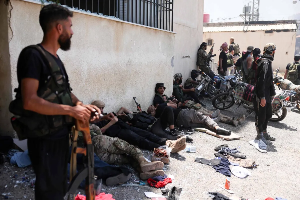 مقاتلون من عشائر البدو يأخذون قسطا من الراحة في مدينة السويداء بعد إعلان وقف إطلاق النار أمس (أ.ف.ب)