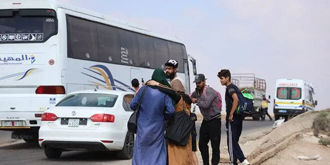 قوافل تُقلّ عائلات البدو المحتجزة في مدينة السويداء إلى محافظة درعا لتأمينها وضمان عودتها الآمنة إلى ديارها (سانا)