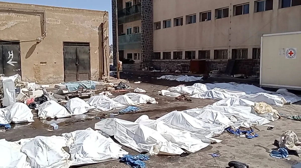 أكياسٌ تحوي جثثاً ملقاة على الأرض في مستشفى السويداء الوطني بجنوب سوريا 22 يوليو 2025 (رويترز)