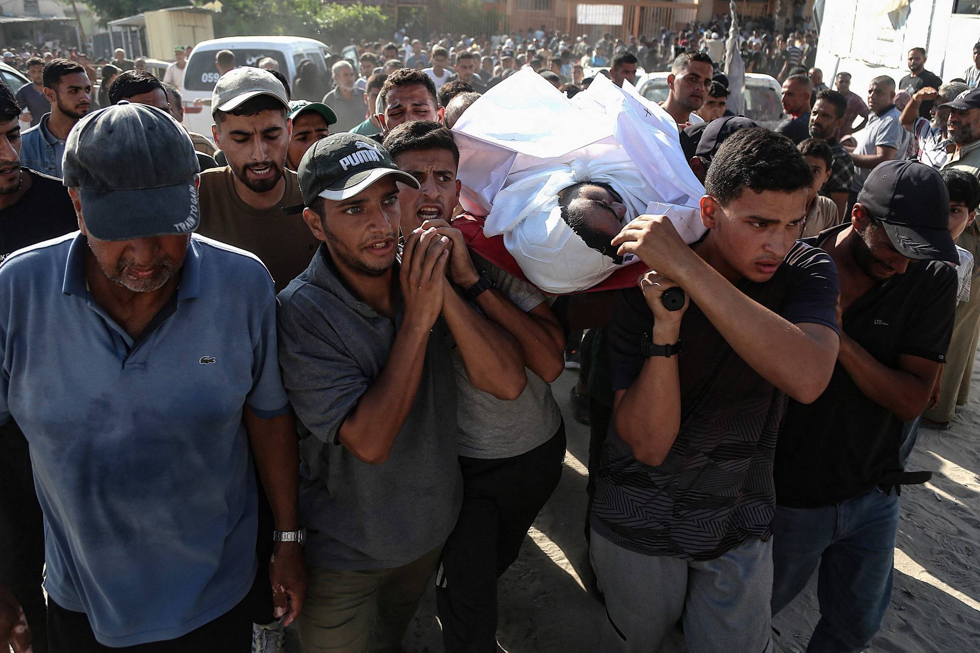 معزون يحملون جثمان رجل من مستشفى ناصر وهو واحد من بين كثير من الفلسطينيين الذين قُتلوا في الغارات الإسرائيلية على المواصي والأحياء الشرقية من خان يونس جنوب قطاع غزة 24 يوليو 2025 (أ.ف.ب)