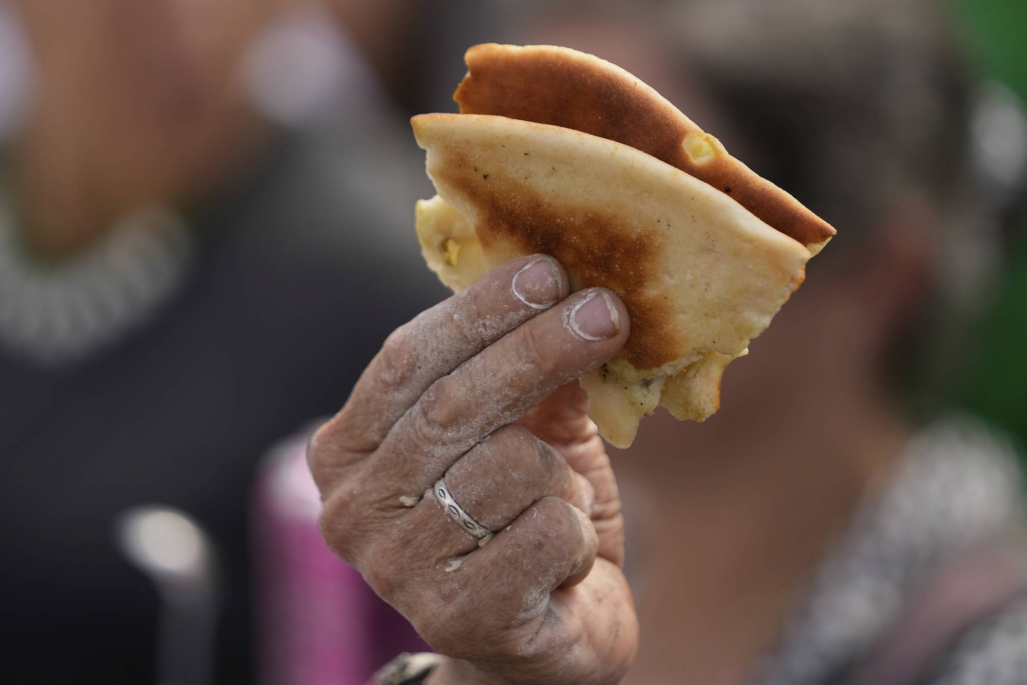 كِسرة خبز تُرفع خلال مظاهرة في بيروت طالبت بإغاثة غزة (أ.ب)