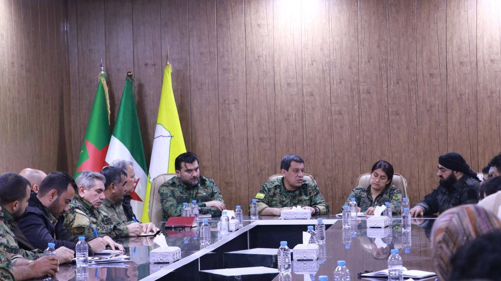 وكانت تقارير إعلامية تحدثت عن اجتماع موسع داخل القاعدة الأميركية في مدينة الشدادي جنوب الحسكة يوم السبت. وقال موقع «تلفزيون سوريا» إن القائد العام لـ«قسد»، مظلوم عبدي، أكد خلال الاجتماع أن «قسد» لا تنوي تسليم مناطقها أو حل الإدارة الذاتية، موضحاً أن أي تقارب مع الدولة السورية سيأتي وفق شروط؛ أبرزها الإبقاء على هيكل الإدارة الذاتية، ودمج «القوات» ضمن ترتيبات متفق عليها. كما أعلن عبدي عن أن لجاناً من «قسد» ستبدأ خلال الأيام القليلة المقبلة سلسلة لقاءات مع الحكومة السورية، بغية تسليم مؤسسات الدولة، بما فيها المؤسسات العسكرية، بدءاً من محافظة دير الزور، على أن تتبعها محافظتا الرقة والحسكة.