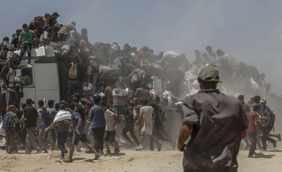 فلسطينيون يتزاحمون للحصول على أكياس دقيق من شاحنة إغاثة قرب نقطة توزيع في زكيم شمال قطاع غزة أمس (إ.ب.أ)