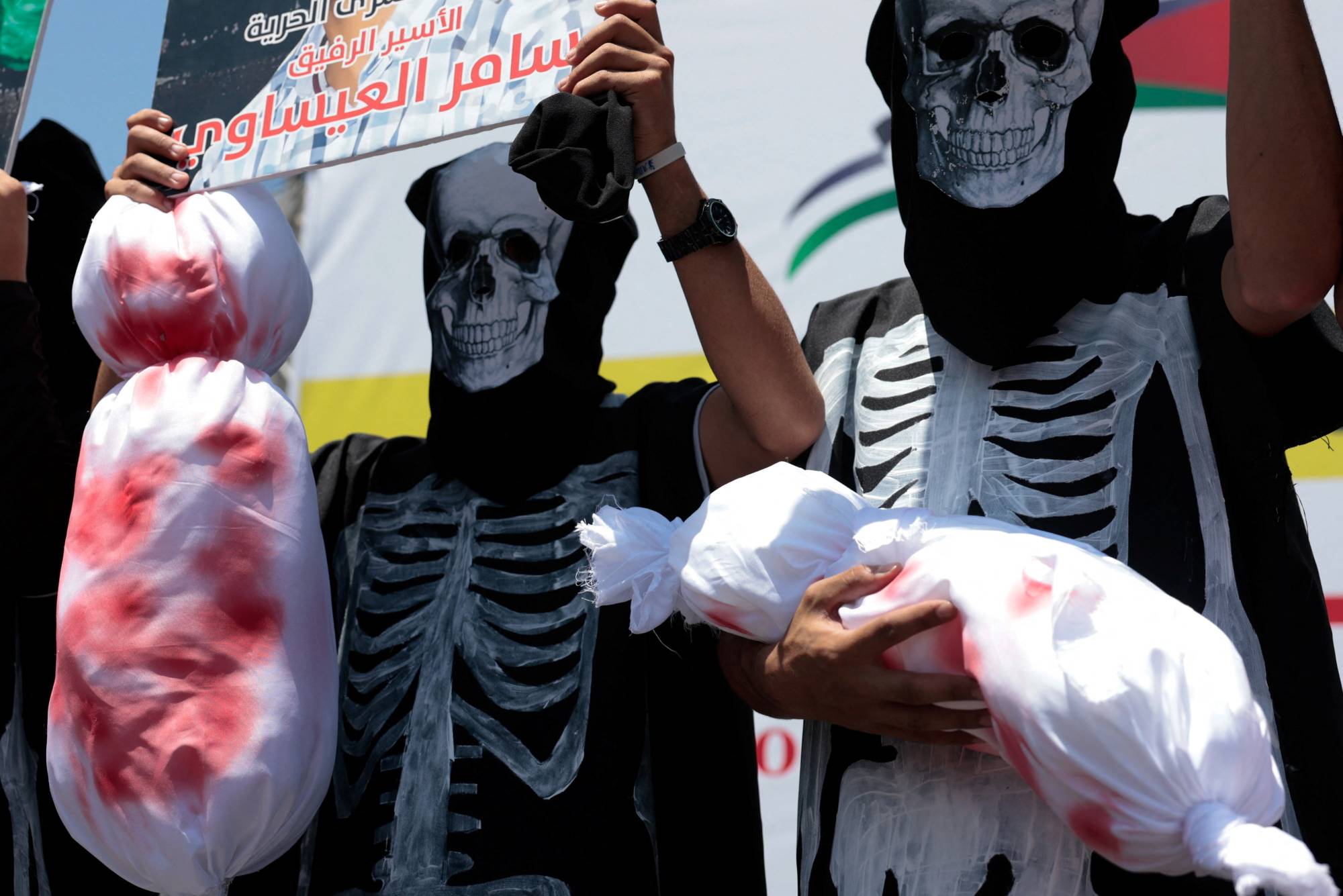 وارتدت مجموعة من المتظاهرين ملابس تشبه هياكل عظمية وحملوا دمى، في إشارة إلى تأثير المجاعة التي يواجهها سكان قطاع غزة، خصوصاً الأطفال، الفئة الأكثر عرضة لسوء التغذية.