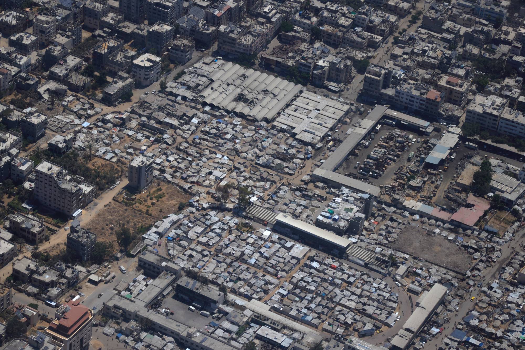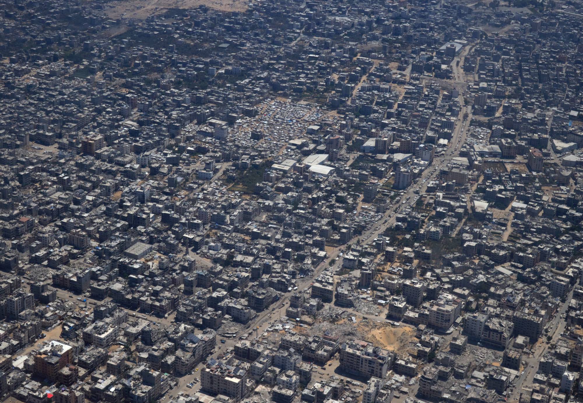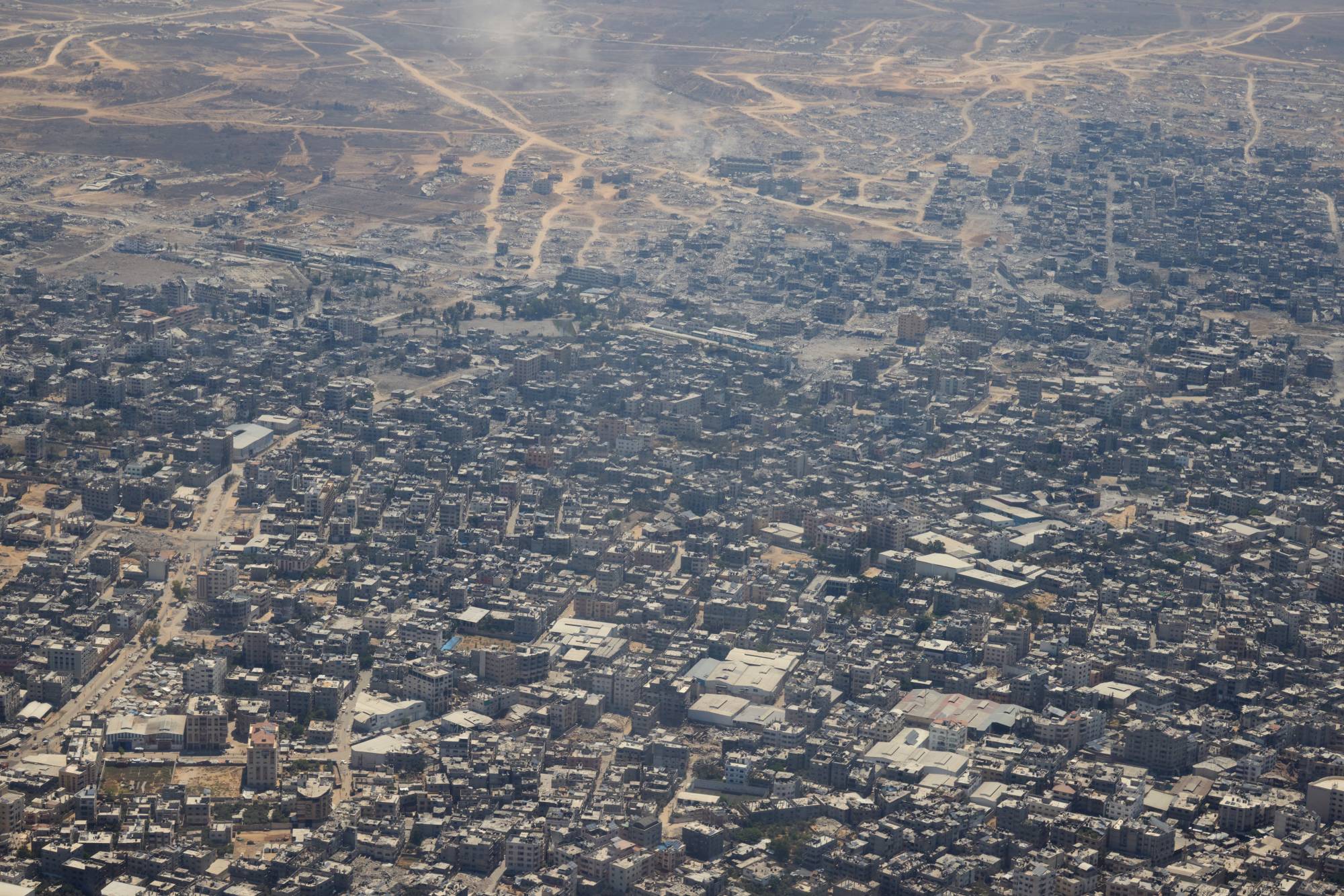 الجزء الأوسط من قطاع غزة كما شوهد من طائرة تابعة لسلاح الجو الألماني أثناء إسقاطها مساعدات إنسانية يوم 6 أغسطس 2025 (إ.ب.أ)