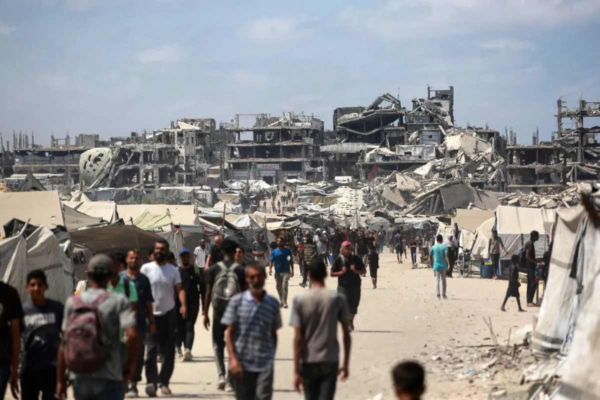 فلسطينيون يسيرون في شارع بالقرب من المباني المتضررة جراء الحرب في مدينة غزة (أ.ف.ب)