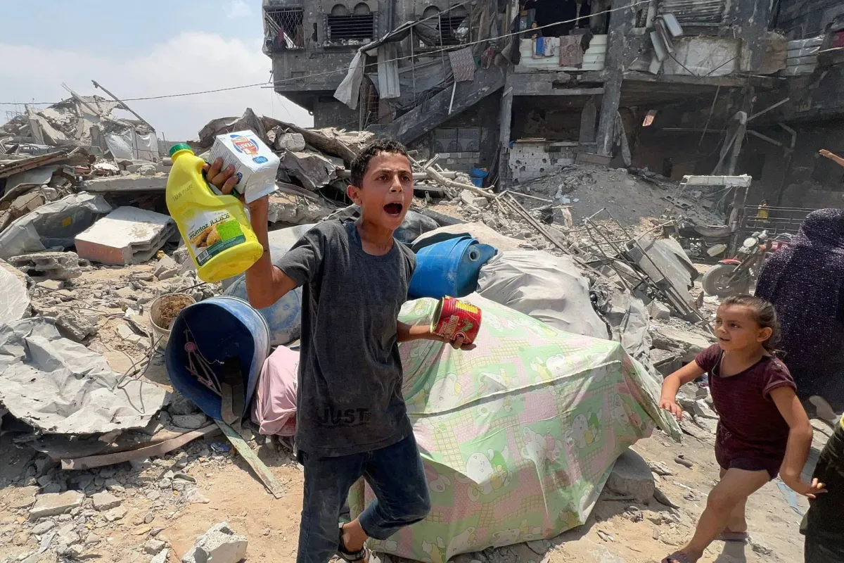 فتى فلسطيني يحمل مواد غذائية استطاع الحصول عليها من حزمة مساعدات أسقطت جوا في جباليا شمال قطاع غزة أمس (أ.ف.ب)