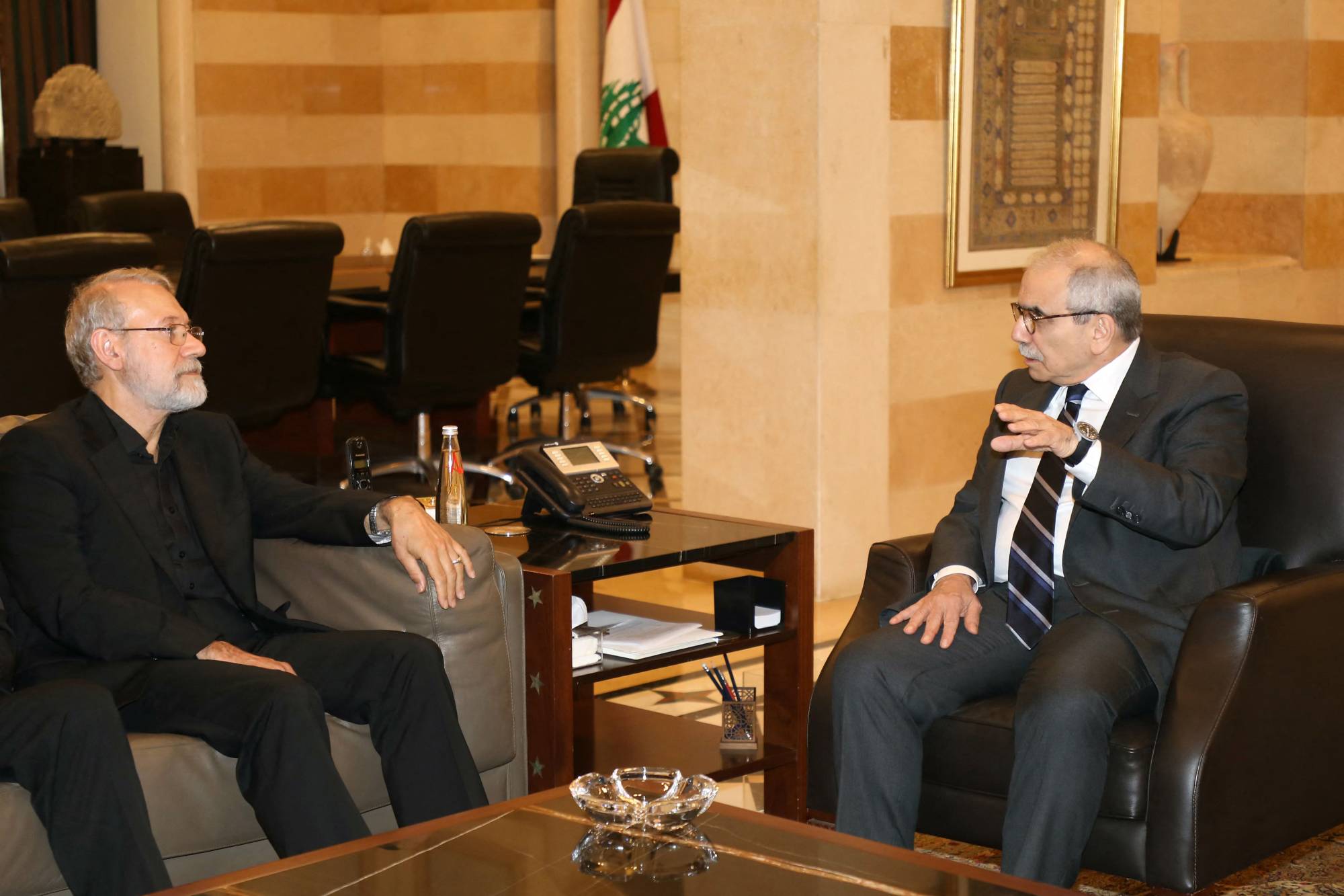 وأكدت المصادر أن لاريجاني لم يسجل اعتراضه على الإطار العام الذي رسمه الرئيس عون لترسيم الحدود السياسية لعلاقة لبنان بإيران، والذي كرره أمامه الرئيس سلام. وقالت بأنهما رفعا السقف في انتقادهما للتدخل الإيراني في الشأن الداخلي، رغم أنه سعى للتصالح مع الذين انتفضوا ضد تدخل بلاده المتمثل بالثلاثي عراقجي وولايتي و«الحرس الثوري»، وتحريضهم «حزب الله» على عدم تسليم سلاحه.