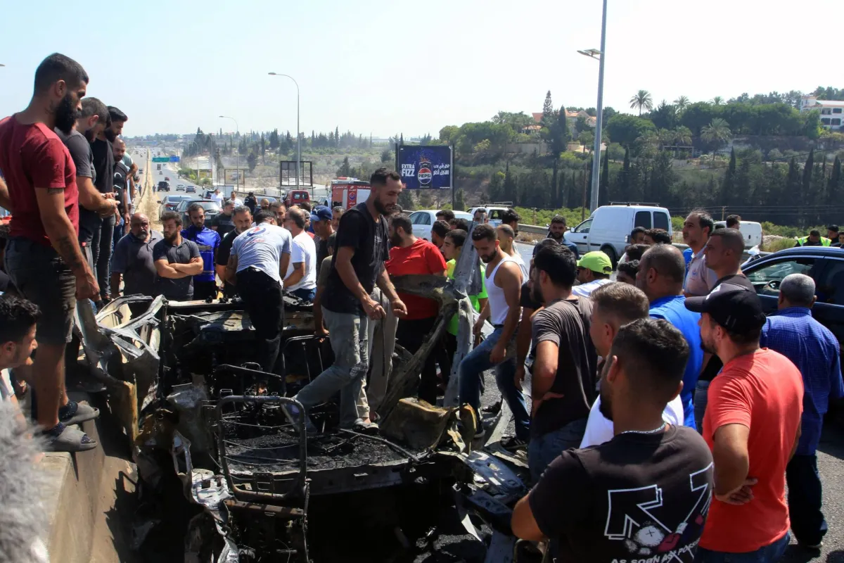 لبنانيون يتفقدون حطام سيارة استهدفتها غارة إسرائيلية جنوب مدينة صيدا (أ.ف.ب)