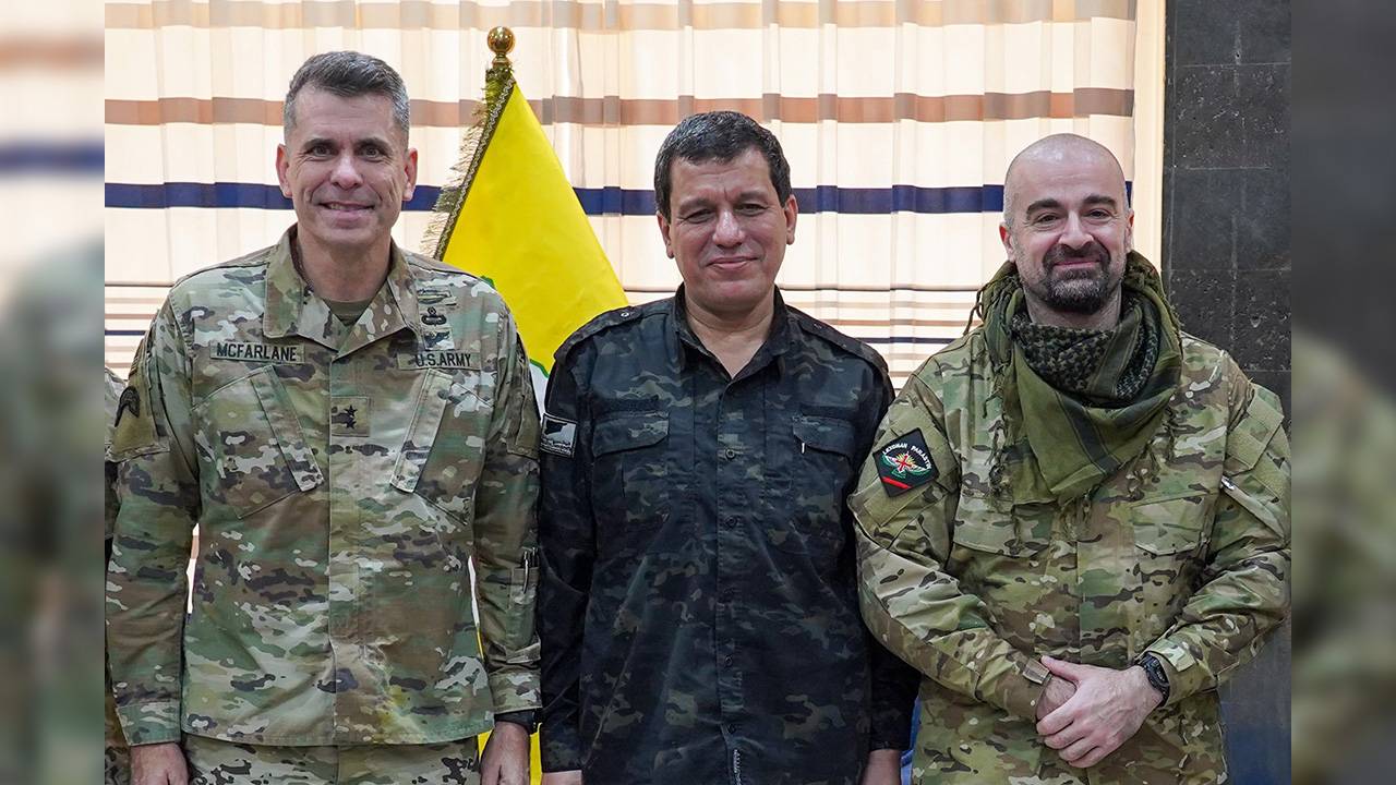 مظلوم عبدي يتوسط زعيم الاتحاد الوطني الكردستاني العراقي بافل طالباني (يمين) وقائد التحالف الدولي ضد «داعش» ماثيو ماكفارلين 2022 (متداولة مواقع كردية)